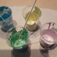In ogni ciotola mettiamo un po’ di tempera ed iniziamo a mescolare fino a quando la tempera si sia completamente amalgamata.