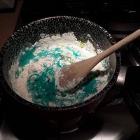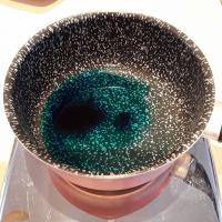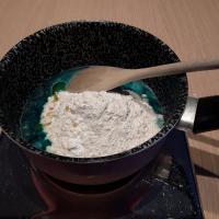 Prendiamo il pentolino, appoggiamolo sopra alla nostra bilancia azzerata e mettiamo prima di tutto gli ingredienti liquidi: l’ acqua,l’ olio il colorante e l’ aroma poi, aggiungiamo , azzerando ogni volta la bilancia,il sale fino, la farina e il cremor tartaro.