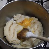 Mettiamo in un pentolino l’ acqua, il sale il burro e portiamo a bollore e, sempre con il fuoco acceso, andiamo ad aggiungere un po’ alla volta la farina, continuiamo a mescolare fino ad ottenere un composto omogeneo. Spegniamo il fornello e di tanto in tanto andiamo a mescolare il composto per farlo raffreddare circa 20 minuti.