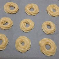 Prendiamo la sac a poche e con il beccuccio grande a stella andremo a formare due cerchi sovrapposti avendo cura di lasciare il buco al centro.